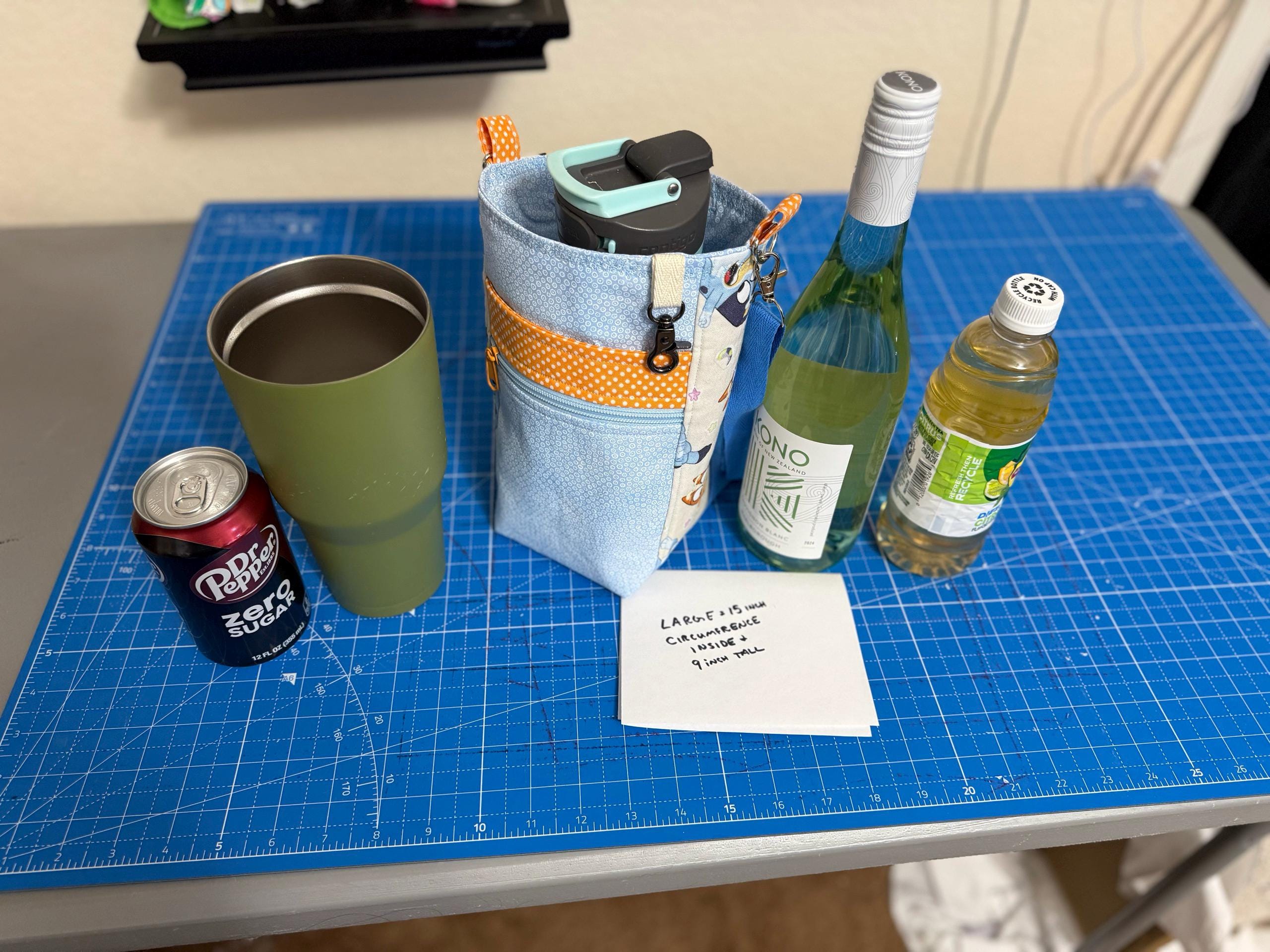 This was a nice pattern for making a bottle bag that did not have a big pouch hanging off the side, but rather an integrated pouch. I made the large size, and it’s quite big! 9” high x 5” diameter (fits a 15” circumference bottle). It can fit a water bottle plus a 16.9oz tea, or a bottle of wine, etc. Maybe I’ll make the small size next! I just wish this was a digital download instead of a printed set of instructions.